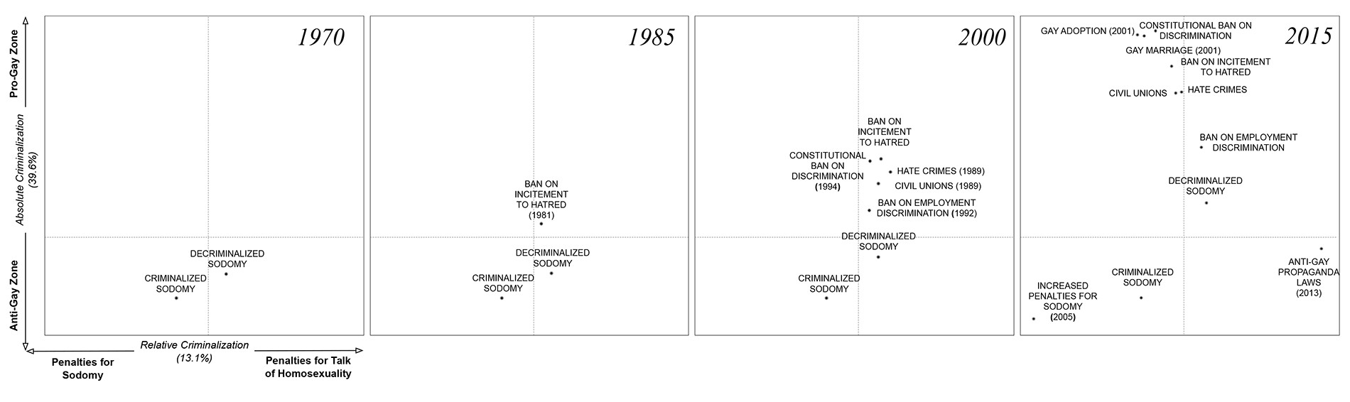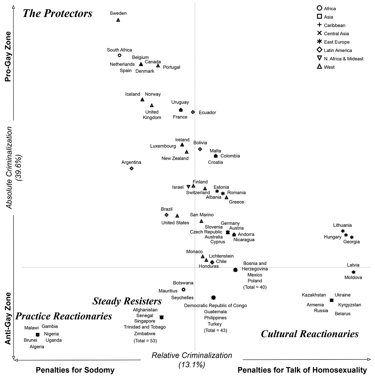 No longer entrusting it to extralegal controls of custom or religion, nations are now bringing homosexuality under the purview of rationalized state policies. No longer restricting it purely to criminal sanction, nations are now governing homosexuality through myriad legal areas, from civil and family to administrative and constitutional law. And as more nations reach for the bevy of formal regulatory options at their disposal, from gay marriage and civil unions to antigay propaganda laws, the global social space has become more defined, more articulated, more differentiated by these regulations.